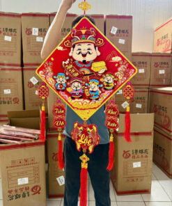 Dây treo trang trí Tết thiết kế chữ Phúc thư pháp kết hợp hình ảnh Thần Tài – biểu tượng của tài lộc, buôn bán hanh thông, tiền vào như nước.